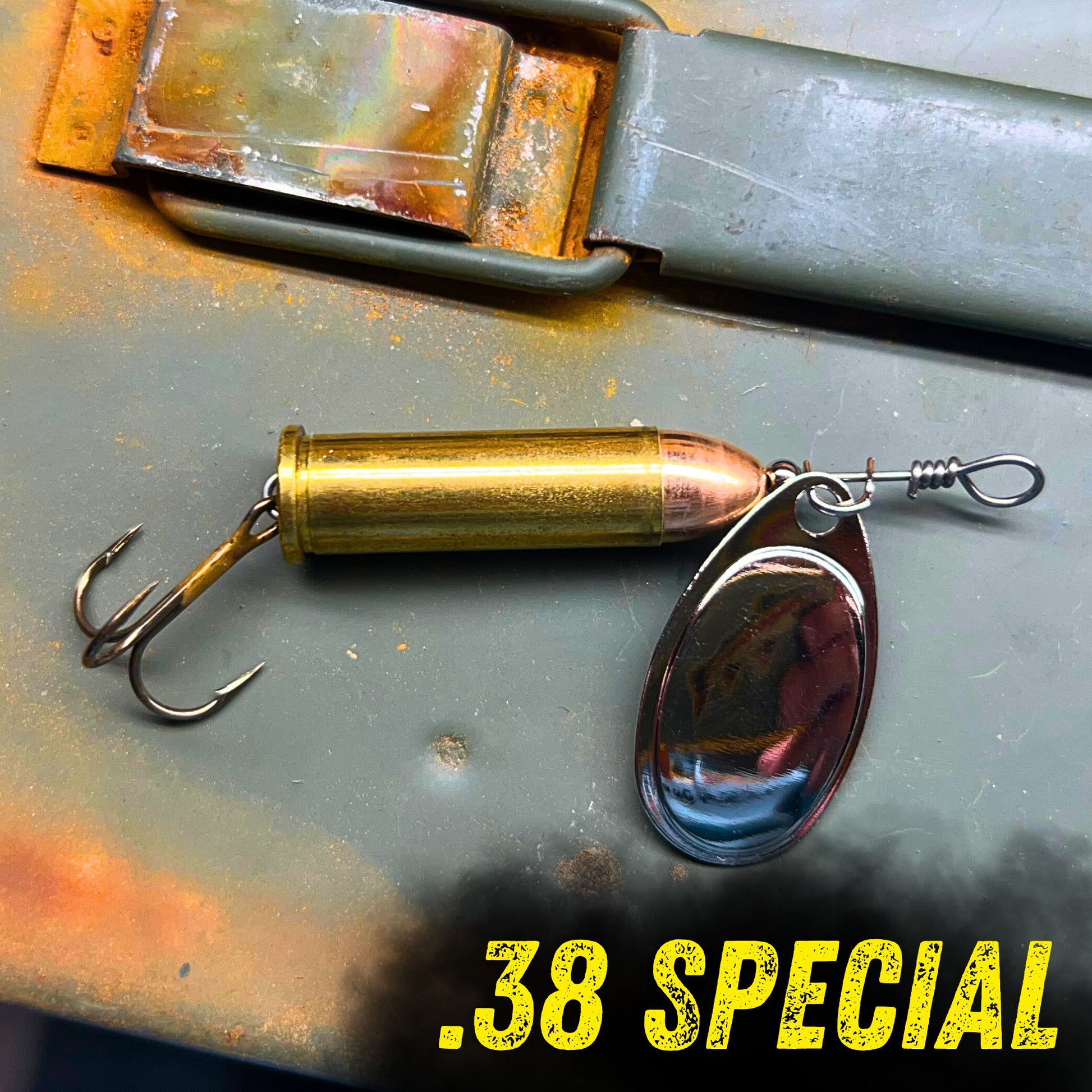Leif's .38 Special Bullet Lure is made from real .38 Special ammo! Perfect for the revolver enthusiast! Featuring a 130gr copper FMJ bullet, #3 French spinner blade, and long shiny brass case, this bullet spinner is a very well spinning, stable fishing lure! Perfect for small to large freshwater fish and small to medium sized saltwater fish.