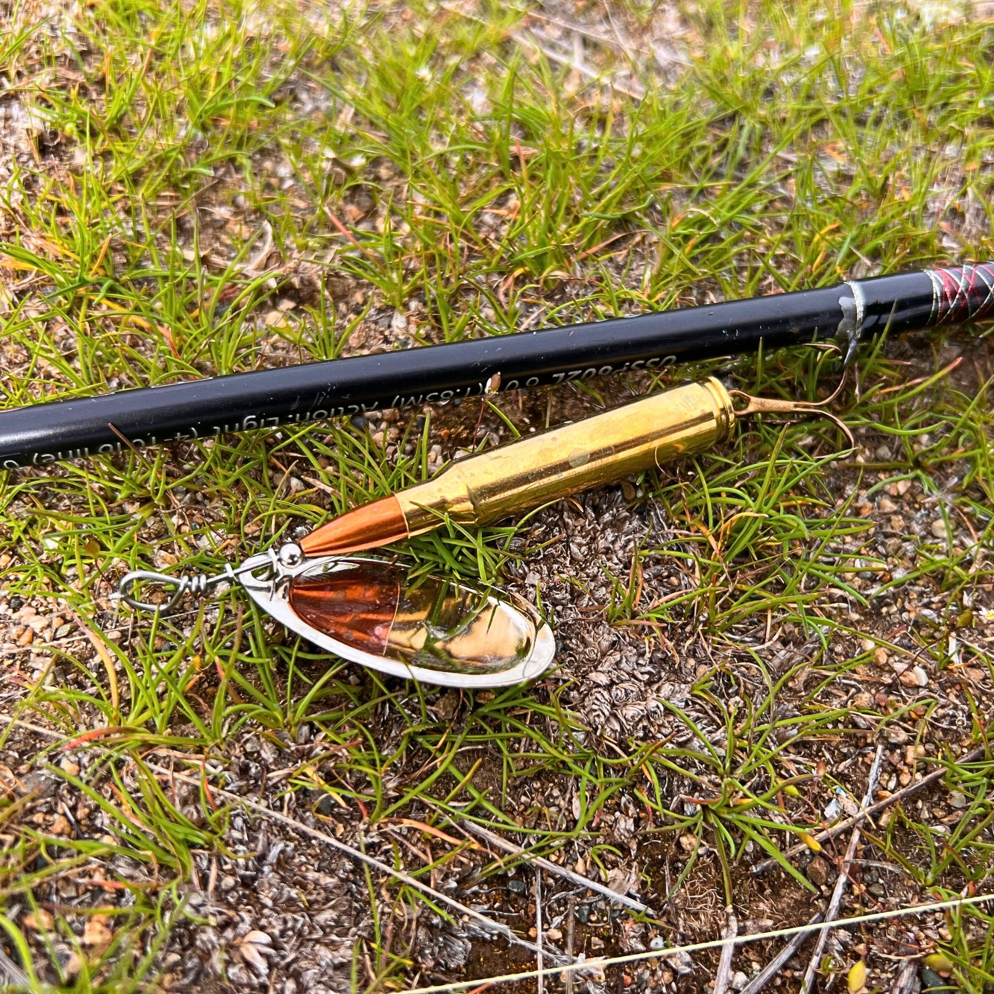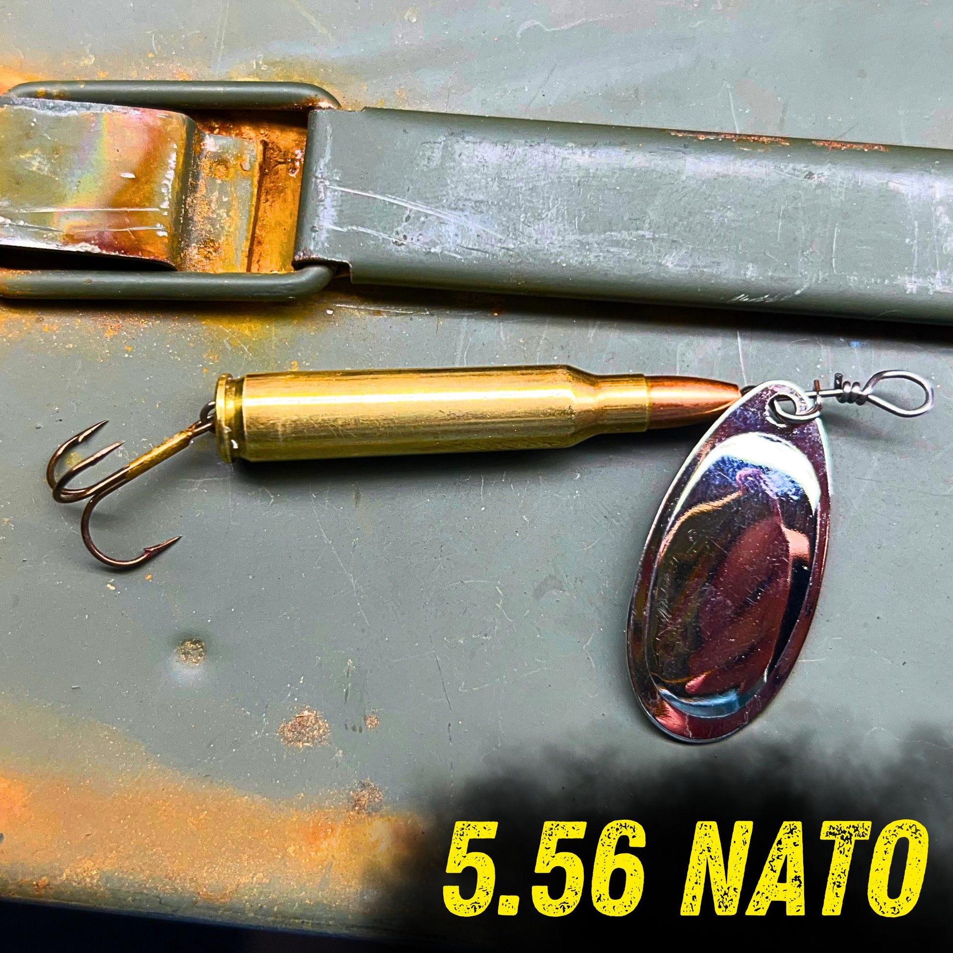 Leif's 5.56 NATO Bullet Lure is made from real .223 or 5.56 ammo! Featuring a 55gr solid copper bullet, shiny brass case, and a #4 French spinner blade, this bullet spinner is perfect for catching larger fish in any lakes and rivers, and would be perfect for trolling! This is a LEAD FREE Bullet Lure!